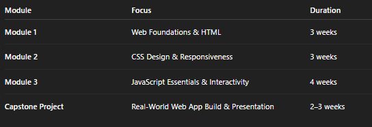 Through guided modules, real-world projects, and mentorship, students will progress from understanding the building blocks of the web (HTML & CSS) to developing interactive web applications with JavaScript.